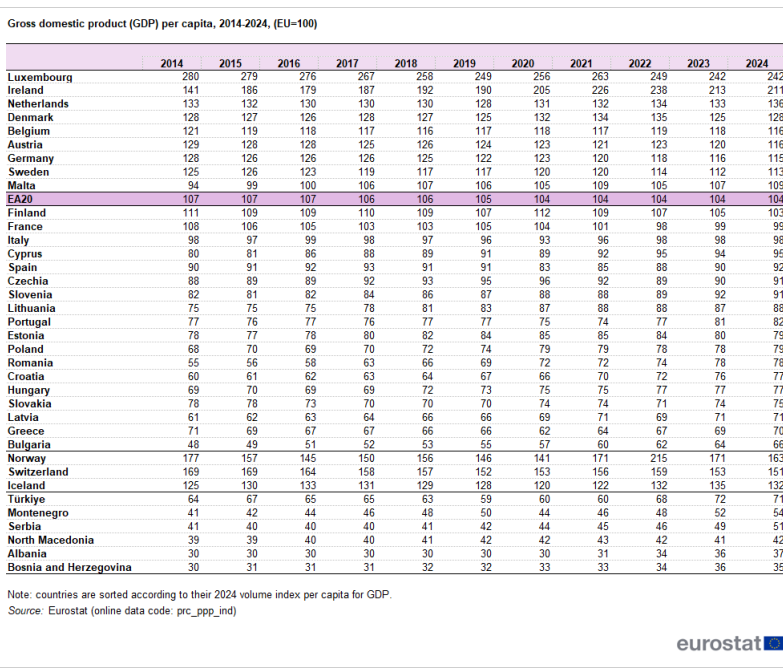 Takođe primjetno je i da se evropske ekonomske sile nastavljaju udaljavati jedna od druge. Luksemburg je i dalje neprikosnoveni lider sa BDP-om po stanovniku koji je 142% iznad prosjeka EU, dok je Irska na drugom mjestu sa 111% iznad prosjeka. Ove dvije zemlje pokazuju neuporedivo visok nivo ekonomskog razvoja i životnog standarda.
