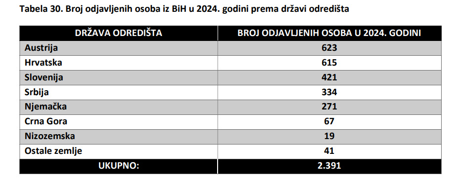 Najveći broj odjava zabilježen je za Austriju – 623 osobe, zatim Hrvatsku – 615, Sloveniju – 421 i Srbiju – 334. U Njemačku je otišlo 271 osoba, dok je u Crnu Goru odjavljeno 67.