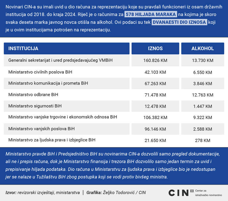 Novinari CIN-a su imali uvid u manji dio ovih računa – iznos od 578 hiljada maraka – koji svjedoče da se novac za reprezentaciju u Vijeću ministara značajnim dijelom troši na alkohol u kafanama i restoranima širom zemlje i u inostranstvu, a pravda kao utrošak na sastancima sa saradnicima, radnim ručkovima ili zvaničnim večerama.