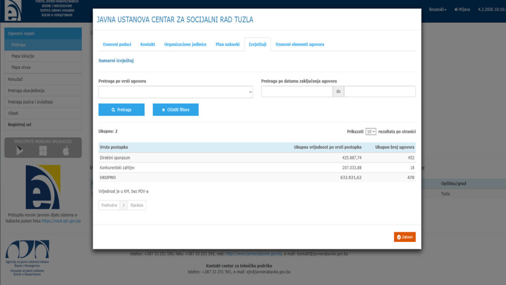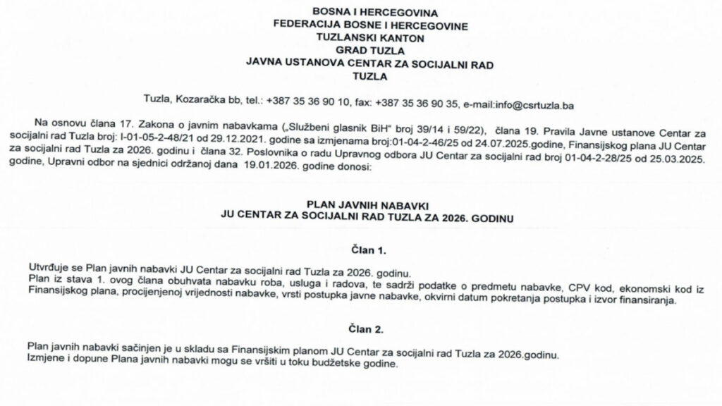 U nastavku našeg istraživanja analizirali smo trošenje budžetskih sredstava u JU Centar za socijalni rad Tuzla i došli do podataka koji otvaraju ozbiljna pitanja transparentnosti i konkurentnosti javnih nabavki u ovoj ustanovi.