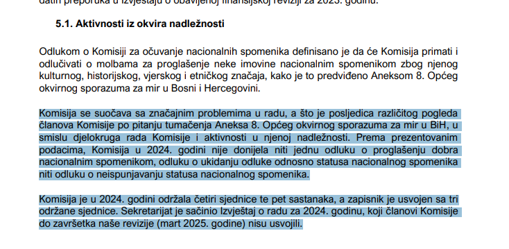 Prema prezentovanim podacima, Komisija u 2024. godini nije donijela niti jednu odluku o proglašenju dobra nacionalnim spomenikom, odluku o ukidanju odluke odnosno statusa nacionalnog spomenika niti odluku o neispunjavanju statusa nacionalnog spomenika”, naveli su revizori.