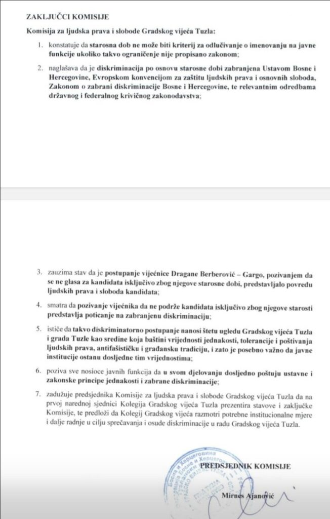 Udruženje „Ne diskriminacija – ne mobing“ Tuzla, kao organizacija čija je misija borba za jednakost i ravnopravnost građana u svim sferama društvenog života, sa posebnim fokusom na radno-pravne odnose i suzbijanje mobinga kao oblika diskriminacije, smatra svojom obavezom reagovati na zaključke i javne istupe Komisije za ljudska prava pri Gradskom vijeću Tuzla.