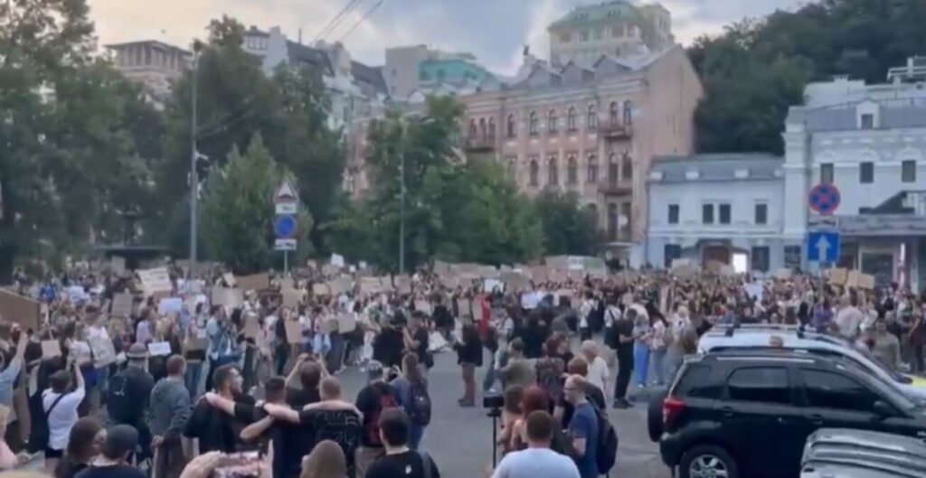 Demonstranti su se u 20 sati po lokalnom vremenu okupili i u blizini kazališta Ivan Franko u centru Kijeva, samo nekoliko blokova od Ureda predsjednika. Glavna poruka bila je usmjerena Zelenskom, ljudi su skandirali: “Veto na zakon.”
