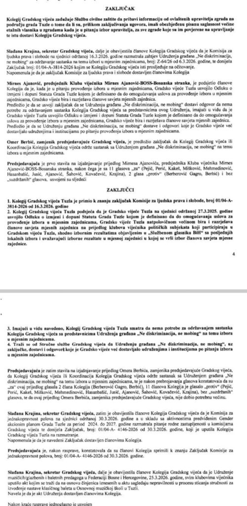 Na sjednici Kolegija Gradskog vijeća Tuzla održanoj 20. aprila 2026. godine razmatran je zahtjev Udruženja „Ne diskriminacija – ne mobing“ Tuzla za održavanje sastanka na temu izbora u mjesnim zajednicama. Međutim, način na koji je ovaj zahtjev tretiran otvara više pitanja nego što daje odgovora.