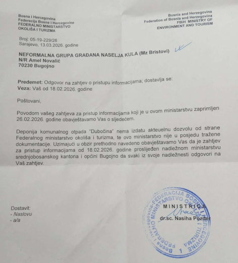 FMOIT u svom odgovoru (broj 05-19-229/26) navodi da deponija “Dubočine” nema izdatu aktuelnu dozvolu od strane ovog ministarstva, te da ono nije u posjedu tražene dokumentacije, kao i da je pristigli zahtjev od mještana prosljeđen nadležnom ministarstvu Srednjobosanskog kantona i Općini Bugojno da svaki iz svoje nadležnosti odgovori na zahtjev.