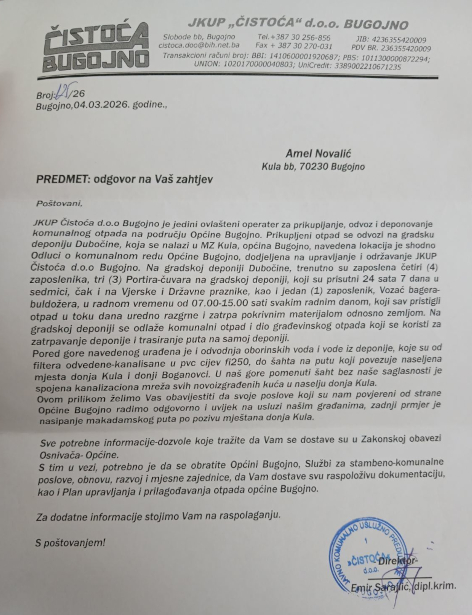 U odgovoru iz JKUP “Čistoća” d.o.o Bugojno se, između ostalog, navodi da je isto preduzeće jedini ovlašteni operater za prikupljanje, odvoz i deponovanje komunalnog otpada na području Općine Bugojno, te da se prikupljeni otpad odvozi na gradsku deponiju Dubočine, koja se nalazi u MZ Kula. Također se navodi da je potrebno da se mještani obrate Općini Bugojno, Službi za stambeno-komunalne poslove, obnovu, razvoj i mjesne zajednice radi dostave raspoložive dokumentacije, kao i Plana upravljanja i prilagođavanja otpada općine Bugojno.