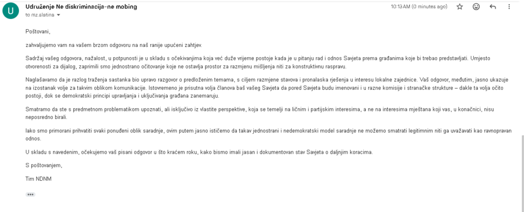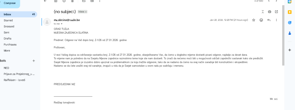 uputili smo zvaničan zahtjev za održavanje sastanka sa Savjetom MZ Slatina u Tuzli. U zahtjevu su bile jasno navedene teme o kojima smo željeli razgovarati – problemi u mjesnoj zajednici, uloga savjeta, učešće građana i moguća rješenja.