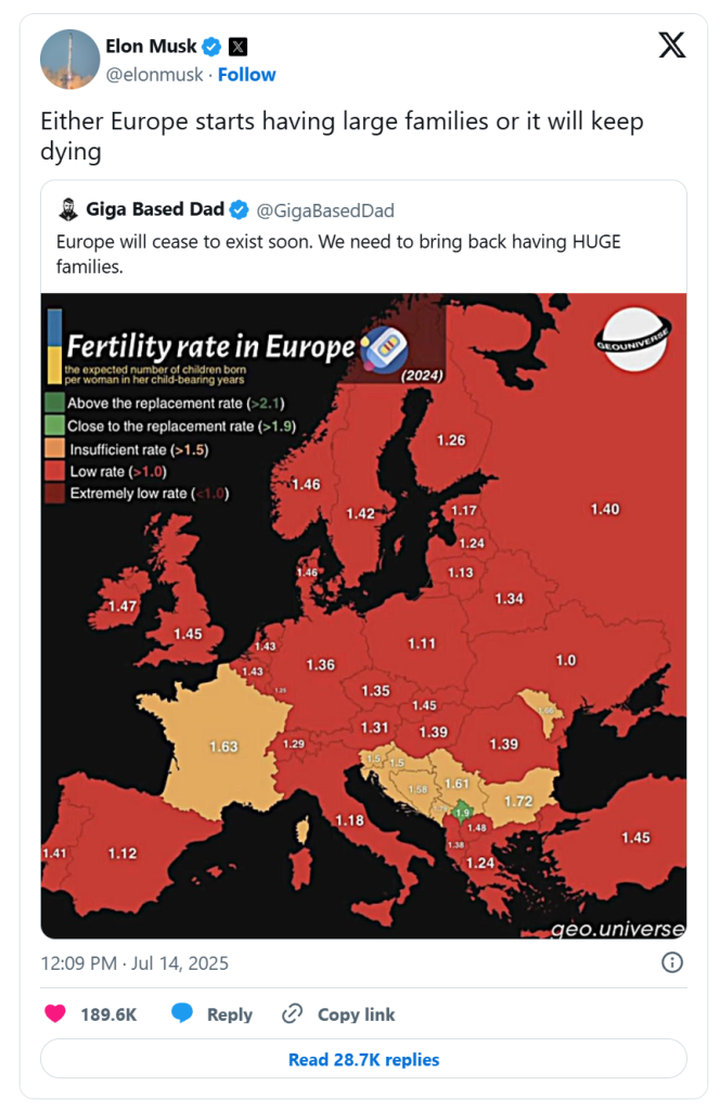 Elon Musk podijelio je ovu mapu uz komentar: „Ili će Evropa početi imati velike porodice, ili će nastaviti izumirati.“