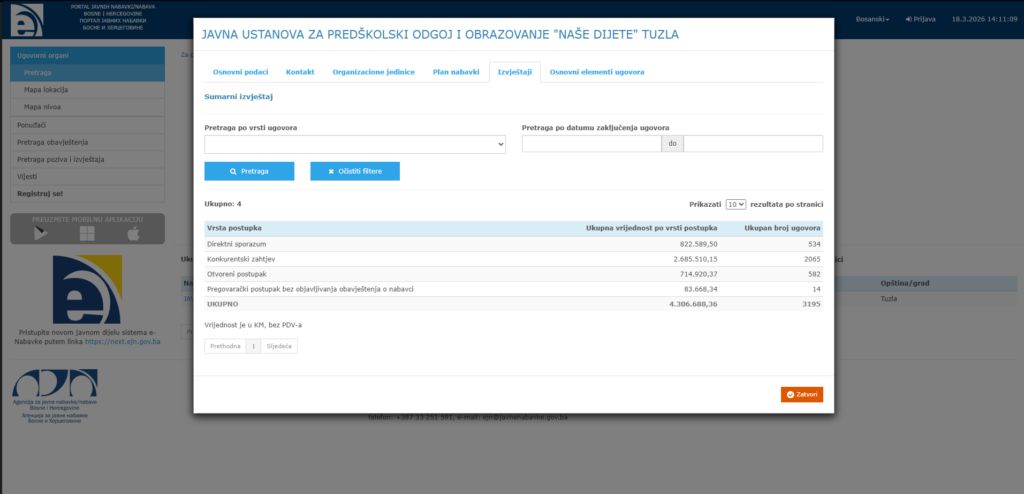 Prema zbirnim podacima dostavljenim redakciji (vrijednosti bez PDV-a), JU Naše dijete Tuzla je realizovala ukupno 3.195 ugovora u vrijednosti 4.306.688,36 KM. Najveći dio ide kroz konkurentski zahtjev: 2.065 ugovora u vrijednosti 2.685.510,15 KM. Direktni sporazumi su drugi po vrijednosti: 534 ugovora i 822.589,50 KM. Otvoreni postupak je treći: 582 ugovora i 714.920,37 KM. Najrjeđi, ali najosjetljiviji po pitanju transparentnosti, jeste pregovarački postupak bez objave obavještenja: 14 ugovora i 83.668,34 KM.