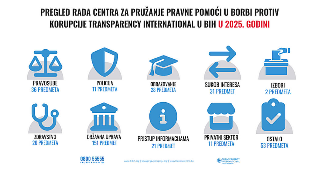 Tokom 2025. godine, Centar za pružanje besplatne pravne pomoći Transparency Internationala u Bosni i Hercegovini (ALAC) zabilježio je rekordan broj zahtjeva građana za zaštitom od koruptivnih praksi. U obradi je bio 364 nova predmeta, dok je putem besplatne telefonske linije zaprimljeno 1.027 poziva građana koji su bili svjedoci ili direktne žrtve korupcije.